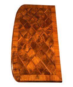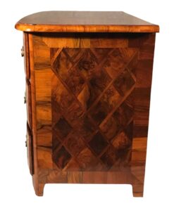 This original 18th century baroque chest of drawers comes from Switzerland. It dates back to around 1760. The slightly convex three drawer chest has a very pretty walnut veneer pattern with diamond shaped inlays. The chest has been expertly refinished in Germany and has a shellac hand polish. It has its original fittings. The price includes the restoration costs and the international shipping costs to Boston.