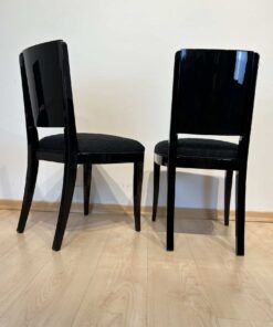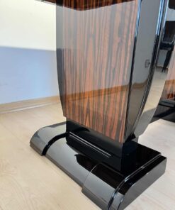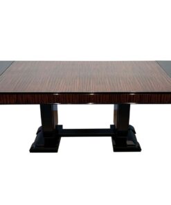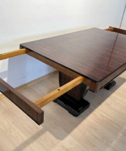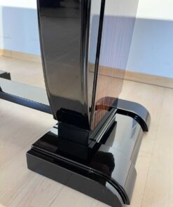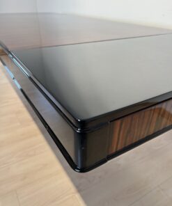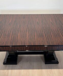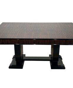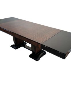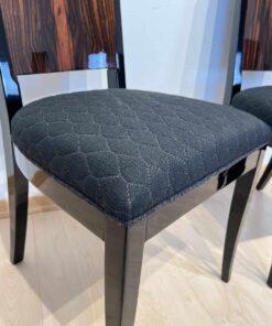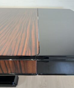 Stunning Art Deco dining room set with expandable table and eight chairs in Makassar Veneer and Black Lacquer. Extendable dining table with top and apron veneered in bright Macassar ebony. High quality piano lacquer high gloss surface. Extendable with insert plates on two sides in black high gloss. Two vase-shaped legs in macassar on a black base. In a Set with 8 original matching chairs also veneered in Macassar (backboard) and black piano lacquer on the frame and behind. Newly upholstery in black/dark grey quilted fabric with keder.