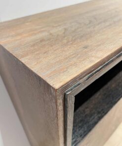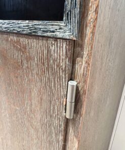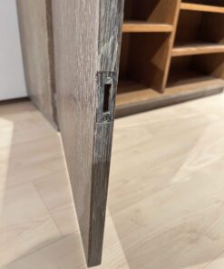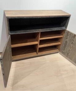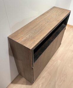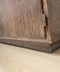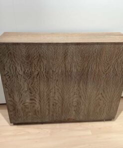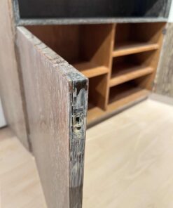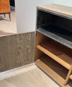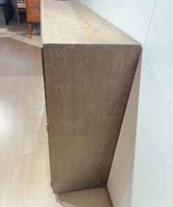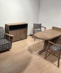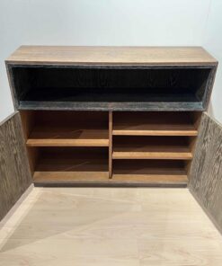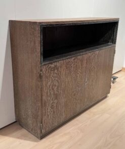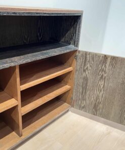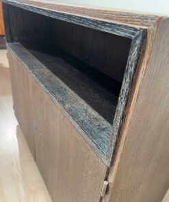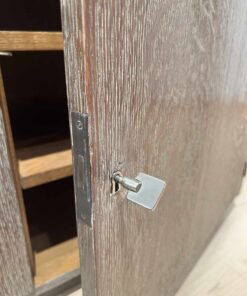 This Art Deco office bookcase by De Coene Frères, crafted in Belgium around 1935, epitomizes the era’s sleek elegance. Constructed from limed oak wood, it features a straight-lined design with a free compartment dyed black on the inside and two doors at the bottom. The top section boasts a free compartment and three oak shelves, offering ample storage space for books and office essentials. Its stainless steel key book and key add a touch of sophistication. With balanced proportions and a recessed base, this vintage bookcase exudes timeless charm and versatility. Part of the esteemed “Depose” series, it can be paired with other pieces from the De Coene Frères office ensemble or stand alone as a statement piece in any space.