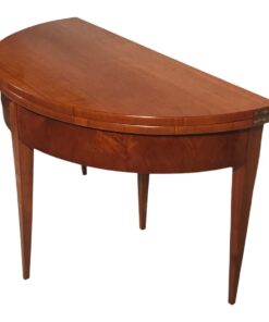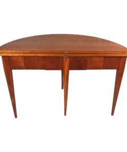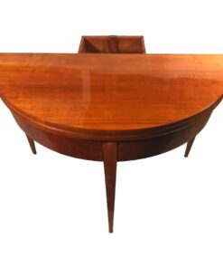 Exquisite 1820s Biedermeier Demi-lune table, boasting the timeless allure of cherry veneer. Standing gracefully on four slender legs, this elegant piece offers more than meets the eye. Its innovative design features a pull-out leg at the back, allowing the unfolded top to rest securely. When gatherings call for extra space, this table seamlessly converts into a dining table, comfortably accommodating four chairs. Meticulously refinished with a shellac hand polish, this antique beauty gleams with renewed vitality, ready to grace your entryway, living room, or dining area with its historic charm and practical versatility. Experience the unmatched blend of sophistication and functionality with this stunning antique table.
