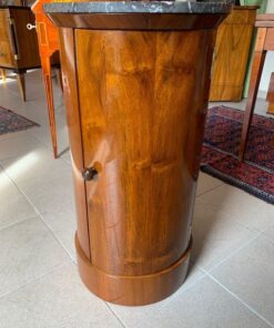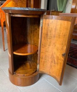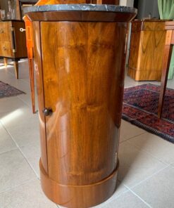Beautiful and elaborately restored Biedermeier drum cabinet from southern Germany from around 1825. Walnut veneer and shellac hand polished with solid marble top as lid.