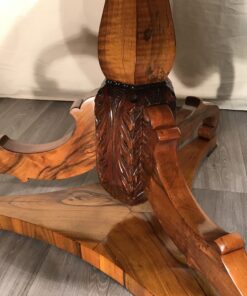This beautiful original Biedermeier table stands out for the gorgeous piecrust walnut veneer on the top. The three curved feet stand on a trefoil base. All parts have a beautiful walnut veneer. The base of the the central octagonal vase foot has three feet attached to it. Additionally, hand carved acanthus leaves decorate its base. The table would be an eye-catcher as a center table in an entryway or you could also use it as a dining table for 4-6 chairs.