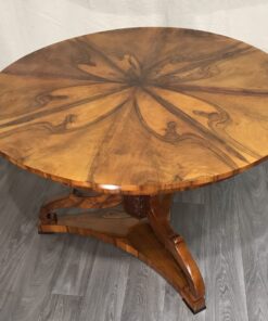 The Biedermeier salon table is in very good refinished condition and measures D: 46.06 inches (117cm), H: 30.70 inches (78 cm) . It ships from Germany and includes shipping costs and customs to Boston.