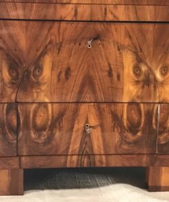 This extraordinary Biedermeier Secretary Desk dates back to around 1820 and comes from southern Germany. The unique desk has a very pretty walnut veneer on the outside, with a beautifully designed mirroring veneer pattern. The secretary desk has three sections. The uppermost one has a central, slightly protruding door, below is the central writing flap with a hexagonal decor on the outside and the lower part has two drawers with a merging arch decor. The inside of the writing compartment combines a central arch with an open compartment which is framed by eight slightly protruding smaller drawers, they feature a pretty maple veneer. Additionally, one larger drawer and a secret compartment offer additional storage space. This gorgeous secretary desk combines the strict lines of the Biedermeier design with a very appealing walnut veneer grain and charming details in the inside of the writing compartment.