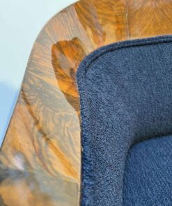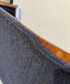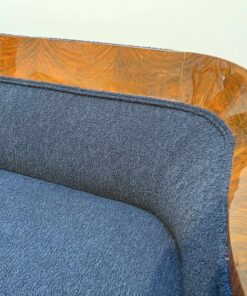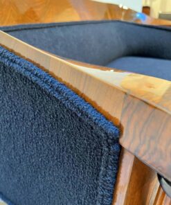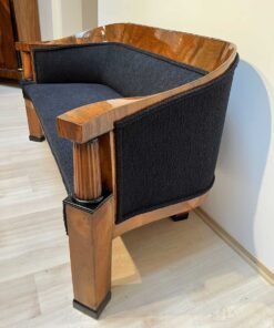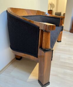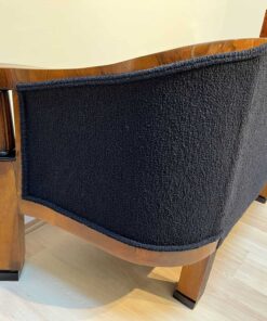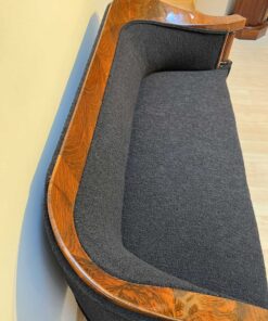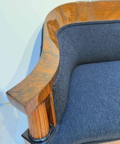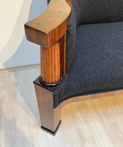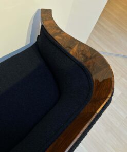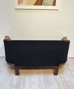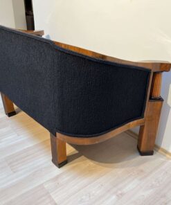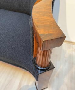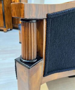 Walnut veneered and solid walnut. Two fluted full columns in beech with ebonized capitals and bases.Newly covered with black teddy (Bouclé) fabric and double keder. The backside is also covered with the same fabric and the sofa can be places free standing in the room. Restored and hand polished with shellac.Very good seating comfort.