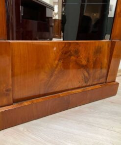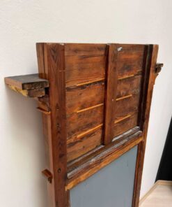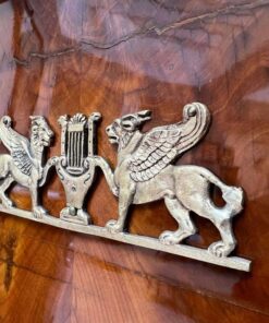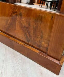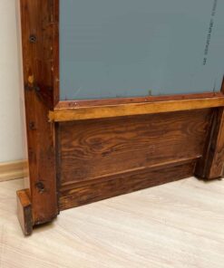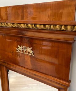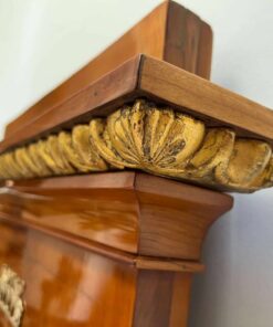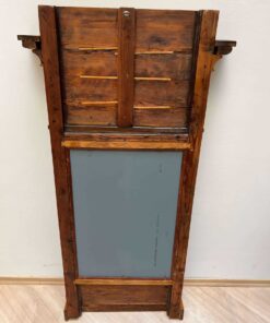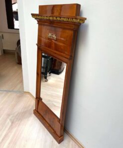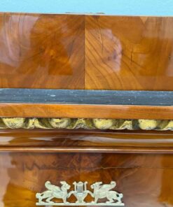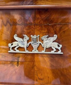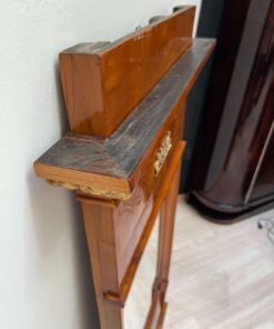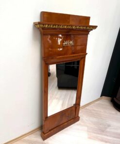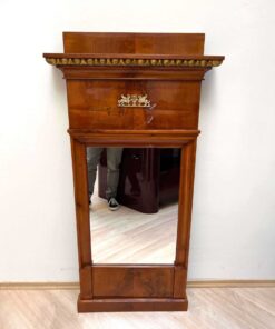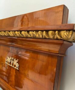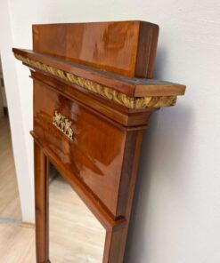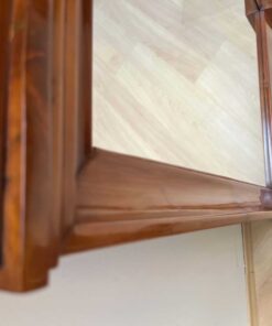 Add a touch of elegance and sophistication to your space with this stunning Biedermeier wall mirror from South Germany, dating back to approximately 1820. The mirror showcases exquisite craftsmanship and neoclassical design, making it a captivating decorative piece. Crafted with cherry veneer on softwood and solid cherry, this mirror boasts a beautiful and rich texture. The hand-polished finish with shellac (French polish) adds a luxurious shine, highlighting the natural beauty of the cherry wood. A standout feature of this mirror is the brass application depicting two winged lions playing the harp, adding a touch of whimsy and charm. The gilded egg bar at the cornice, kept in an old gold hue, further enhances the mirror’s visual appeal. Overall a wonderful piece of antique furniture!