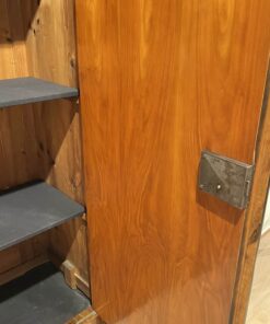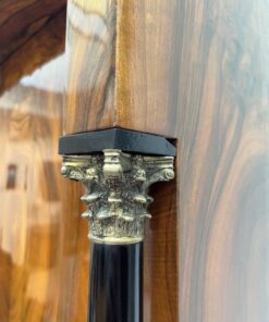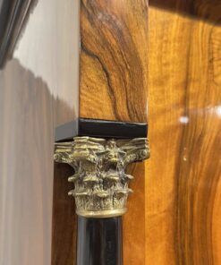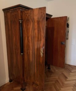 A very elegant Empire armoire from Vienna, Austria. This piece dates back to 1815 and was built in the transition phase between the epochs of Empire and early Biedermeier. The armoire showcases a lovely walnut veneer with original brass hardware. The veneer is beautifully book-matched and hand polished with shellac (French Polish). It is quite unadorned in its shape and speaks through the vividness of the veneered walnut wood. The armoire has two ebonized full-columns with brass bases and Corinthian capitals. A black cotton fabric covers three inlay plates found inside the armoire. Customize the plates depending on your needs! The armoire is completely detachable for transport (top, bottom, two sides, two doors, two back panels). Overall, a wonderful armoire that would make a great addition to any home.