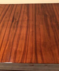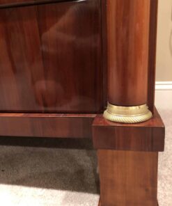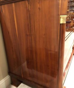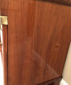 The commode has a beautiful plum veneer and is partially ebonized. Four drawers, flanked by half columns with delicate brass fittings around capital and base, structure the front. The top is protruding. Â Ebonized escutcheons decorate the dawers.