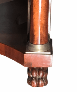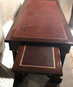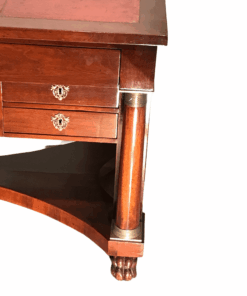 This Empire desk dates back to around 1830-40 and was made in Northern Germany. The spacious desk has a total of five drawers and pull out shelf. The elegant design has the typical characteristics of the Empire style like, for example the column shaped legs which Stand on lion paw feet. The legs are connected by a concave stretcher. The top of the desk is covered with a maroon colored leather. This beautiful piece would be the perfect desk for a home office.