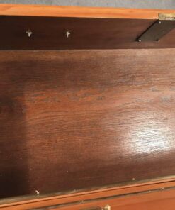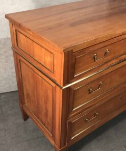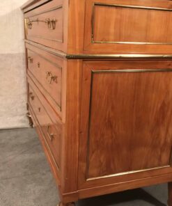 A warm colored cherry veneer embellishes this beautiful French antique chest of drawers. Behind the upper drawer is a writing top with 4 small drawers and a central open compartment. Prestigious green leather covers the middle part of the writing surface. Â Brass fittings and hardware decorate the drawers and feet of this exquisite piece.