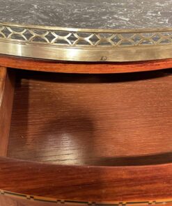 A Bouillotte table, historically used for card games, features a distinctive metal gallery surrounding its top, often graced with luxurious marble. It typically includes at least one drawer and sometimes a pull-out tray.