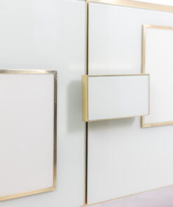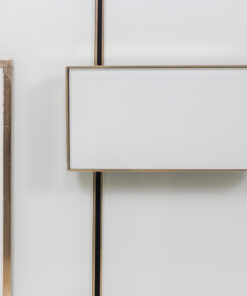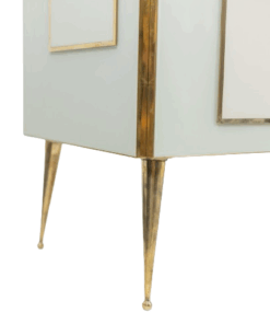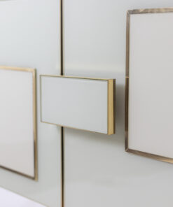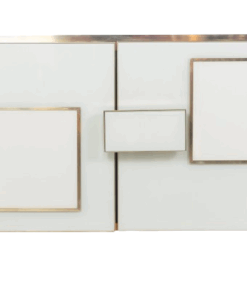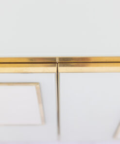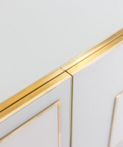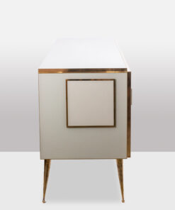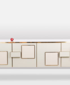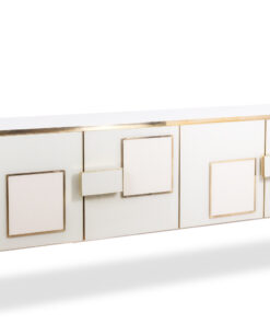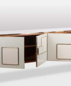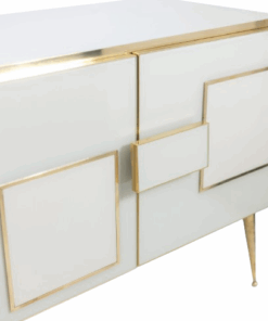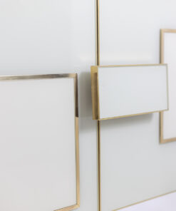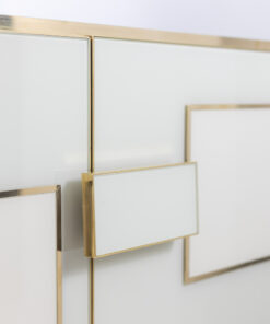 This contemporary Italian geometric sideboard stands out with its striking design and premium materials. The sideboard features a sleek white-colored glass front and gilded brass accents, making it a sophisticated addition to any modern interior. It opens with four doors, each adorned with square and rectangular shapes, and uses rectangular handles for a cohesive look. The spindle-shaped gilded brass base ends in small decorative balls, adding a touch of elegance and uniqueness.