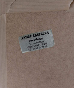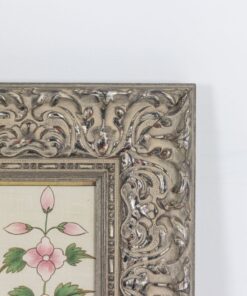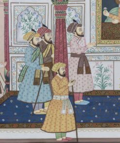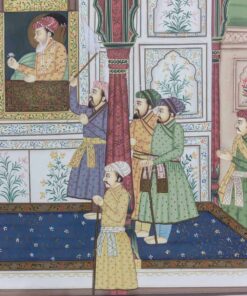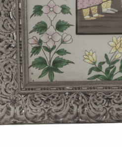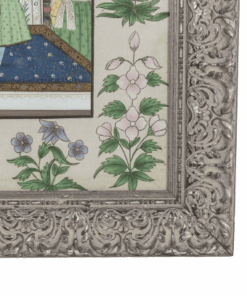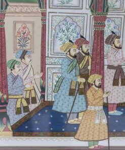 Immerse yourself in the cultural richness of an Indian watercolor on silk palatial scene with this captivating work from the 1950s. This exquisite artwork portrays traditional figures adorned in vibrant attire, set against a backdrop of intricate floral motifs. Housed in a finely crafted gray lacquered wooden frame, this artwork adds a touch of elegance to any space while offering a glimpse into the cultural heritage of India.