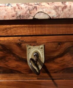 Above the writing surface is one drawer, the lower part has two doors. Behind the writing surface are a total of eight drawers and one shelf. It has an exquisite rose colored marble top.