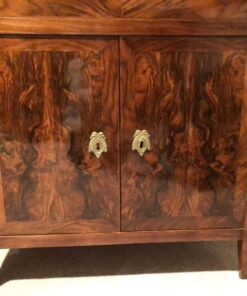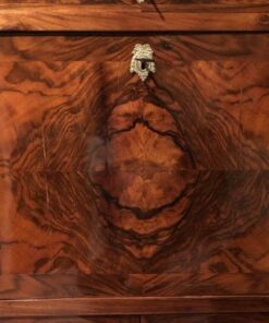 Beautiful mirrored walnut root veneer and carved rosettes ornaments on the corners embellish this charming Louis XVI drop front desk.