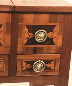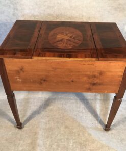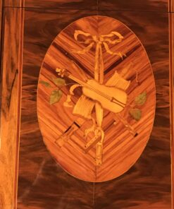 Enhance your bedroom with the sophisticated elegance of this exquisite antique Louis XVI Vanity or Poudreuse from Germany, circa 1780. Crafted from walnut veneer, this exquisite piece features intricate marquetry using on the top, showcasing musical instruments and leaves. The vanity boasts three front drawers, a flip-up mirror, and two flaps that open to reveal compartments for cosmetics. Expertly refinished with a shellac hand polish, this beautiful vanity is ready to add a touch of luxury to your space. Shipping from Germany to Boston is included in the price.