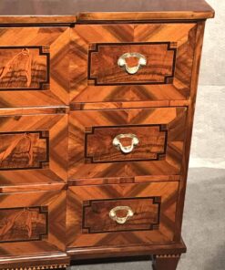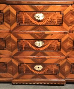 This unique Louis XVI Walnut Chest of Drawers dates back to around 1780 and was made in Southern Germany. The three drawer dresser has a gorgeous walnut veneer with geometric ribbon intarsia framing the different wood grains. Additionally, the top and front have beautiful marquetry decorations. One original key and original brass fittings. The Neoclassical chest of drawers comes refinished and has a shellac finish.
