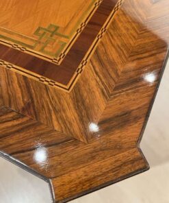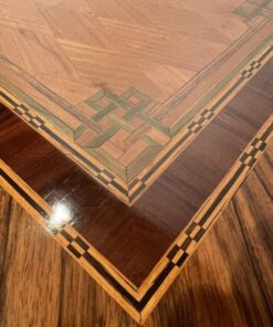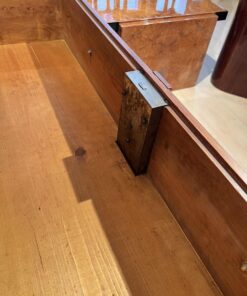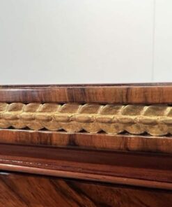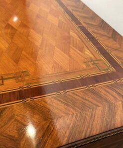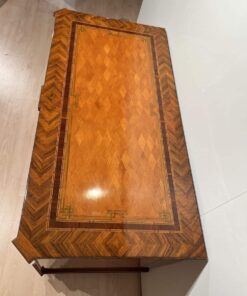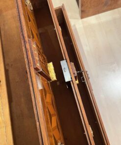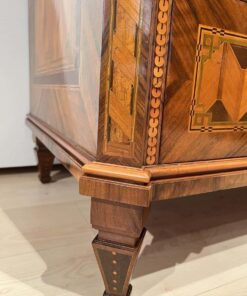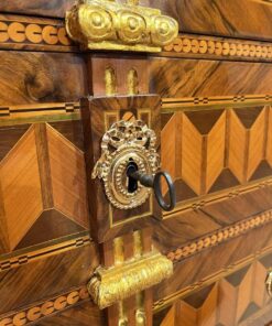 Walnut and cherry veneer with inlays in plum, maple, ebony and green-stained wood. Gd-leaf decorative strip above and below and ornaments in the middle. Original bronze fittings, newly gd-plated.