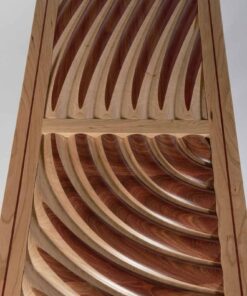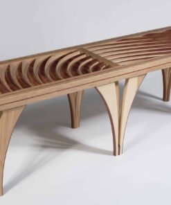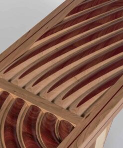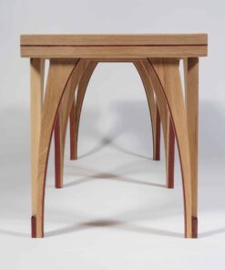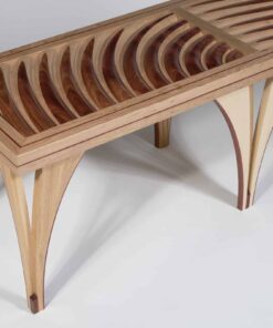 The frame, expertly made from cherry, showcases intricate bloodwood inlay detailing that elevates the bench’s visual appeal. Notably, the split legs form a graceful colonnade of arches, each adorned with a striking bloodwood detail and an inner curve laminated with bloodwood, creating a unique fusion of aesthetics and craftsmanship.