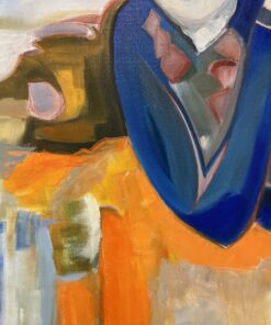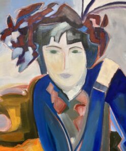 This modern painting by Cécile Ganne “Portrait of a Lady” was inspired by copies of “La Mode illustrée,” one of the first French Hand Colored Fashion Advertisement issued at the turn of the 19th-20th century. As a child, she would spend hours tracing the contours of the alluring and elegant silhouettes gracing the pages of the fashion brochure. While the lady’s outfit and ornate hat are reminiscent of 19th century fashion, the rest of her accoutrements merge into a modern landscape. The palette knife gives the painting texture and structure while the brush strokes and colors are bold and vibrant. The dynamic combination between orange and blues will create a great focus point for a modern living setting and and add old world charm to any contemporary décor.