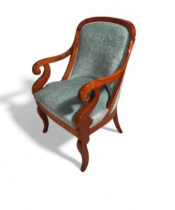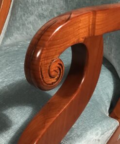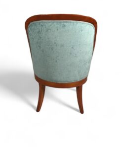 This exquisite pair of Biedermeier barrel chairs, originating from Southern Germany circa 1820, showcases a stunning cherry veneer complemented by newly upholstered light blue velour fabric. Each Biedermeier chair features a distinctive barrel-shaped back and elegant armrests ending in a volute. These chairs are meticulously refinished to enhance their timeless beauty, making them a perfect blend of antique charm and modern sophistication.