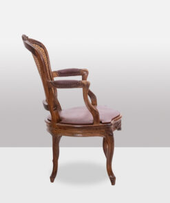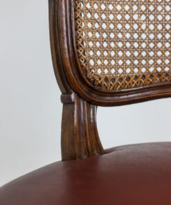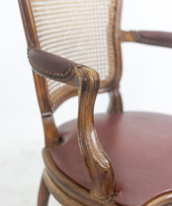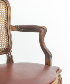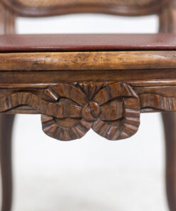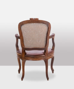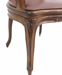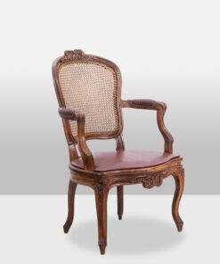 Discover the charm of the Louis XV period with this exquisite pair of “Cabriolet” armchairs, stamped F.L. and originating from the Rhône Valley around 1760. Crafted from elegant walnut, these armchairs feature intricate ribbon decorations on the top of the backrest and the center of the belt. The caned seats and backs showcase rich red leather pads, offering both sophistication and comfort.