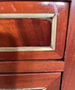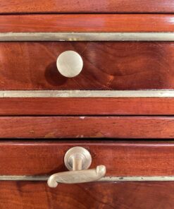 Adorned with captivating veneer decor on all sides, these nightstands boast brass bands on the front and retain their original bronze fittings, adding to their authenticity and charm.