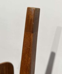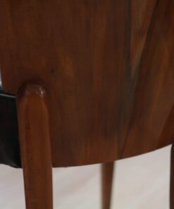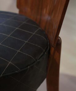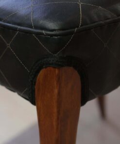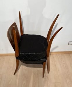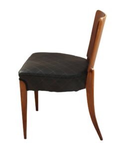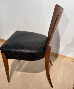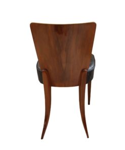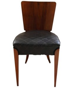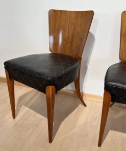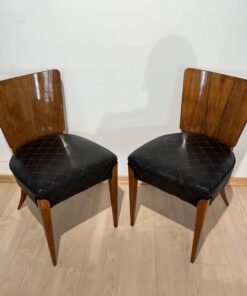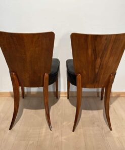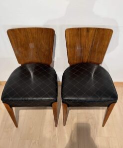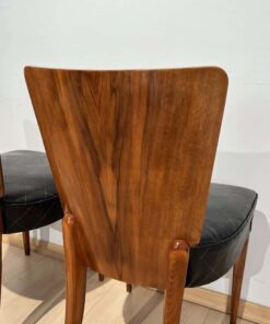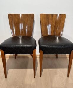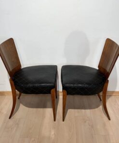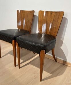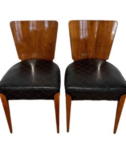 Enhance your dining area with this remarkable pair of Art Deco J. Halabala H214 chairs, designed by Jindrich Halabala in the 1930s. Crafted in Czechia, these chairs exemplify the timeless beauty of the era. The walnut veneer on the backboard adds an elegant touch, complemented by the sleek beech legs. With their newly upholstered seats, featuring black leather and brown stitching, these chairs offer both style and comfort. The restored condition and shellac hand-polished finish ensure their impeccable appearance. Whether you’re hosting a dinner party or enjoying a meal with your loved ones, these J. Halabala dining chairs will elevate your dining experience. Embrace the iconic vintage design and add a touch of sophistication to your space with this exquisite pair of chairs.