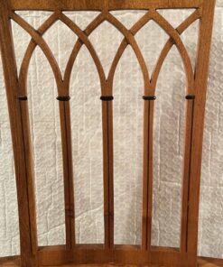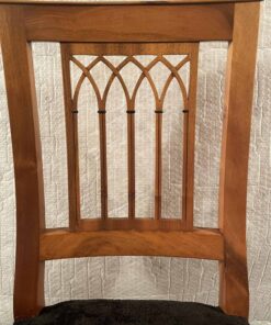This unique set of six antique Biedermeier chairs dates back to 1820-30 and comes from southern Germany. The chairs have a beautifully designed back with an open work pointed arches decor. They have been expertly refinished and have a new upholstery. The seats are covered with a pretty black Chenille fabric by JAB Anstoetz “Balou”. The dining chairs can be combined with a modern design table or a traditional Biedermeier table.