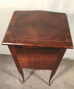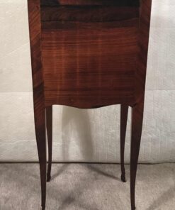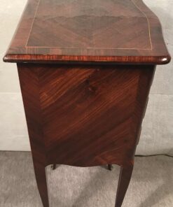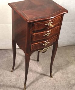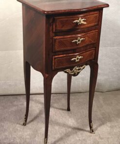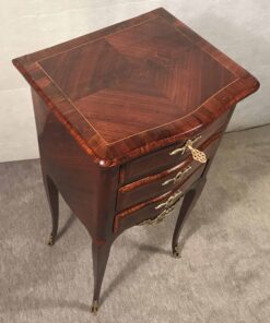Small Rococo style chest of drawers or nightstand, France 19th century. This beautiful small dresser has a gorgeous kingwood veneer and is decorated with Rococo Style bronze fittings. It comes fully refinished with a shellac polish. The back of the dresser has a veneer as well, so it does not have to be placed against a wall.